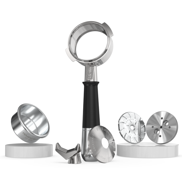 At its heart is the Pesado hybrid portafilter with threaded bottomless body and detachable spouted system, allowing you to toggle between naked and spouted configurations in seconds. Built entirely from premium 304 stainless steel, this tool delivers commercial-grade durability and ideal heat retention.